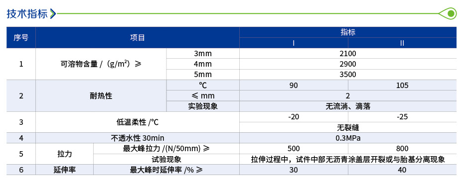 1.聚酯胎體和SBS改性瀝青兩種高性能材料的組合,綜合性能優(yōu)異,可形成高強度防水層;